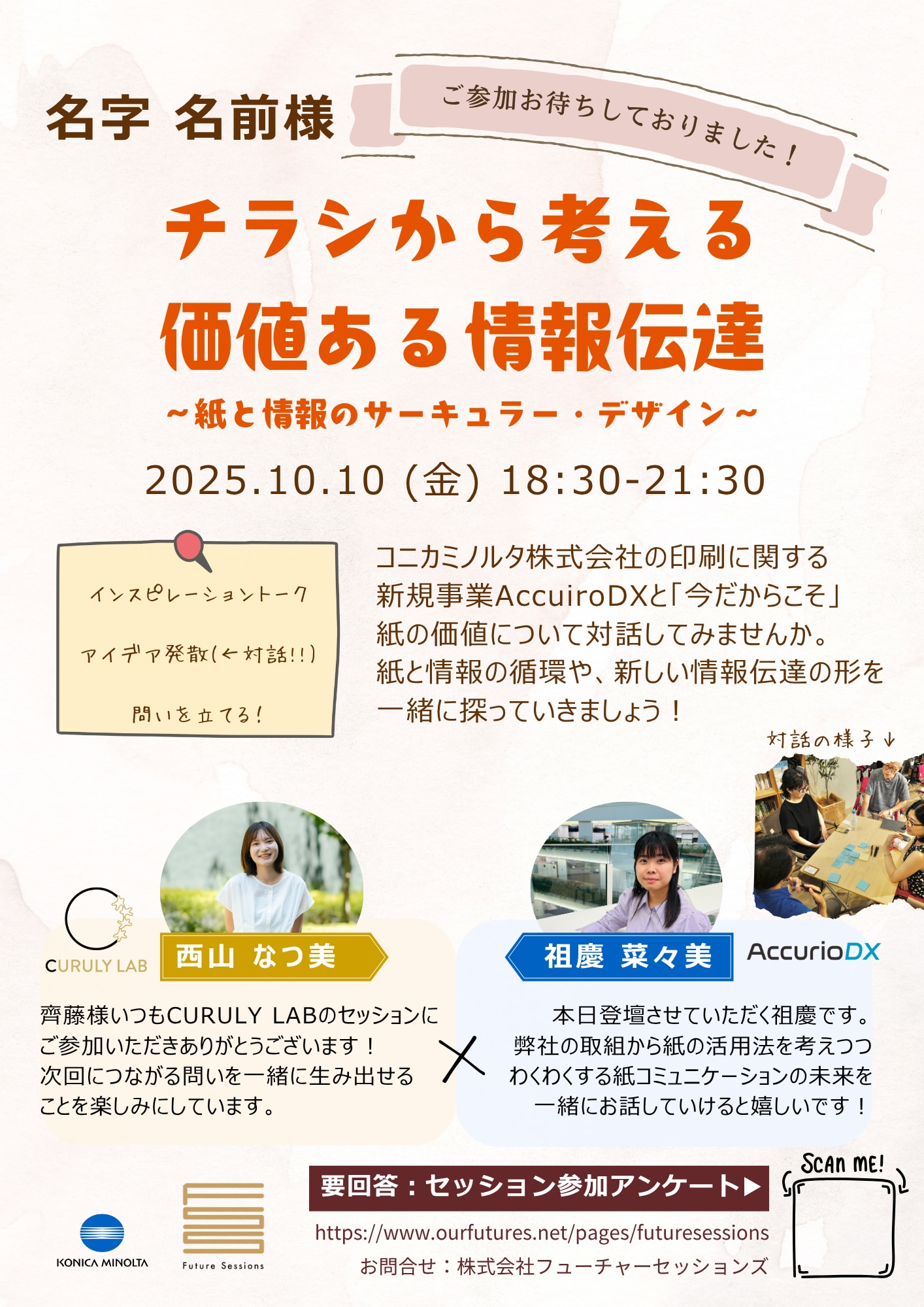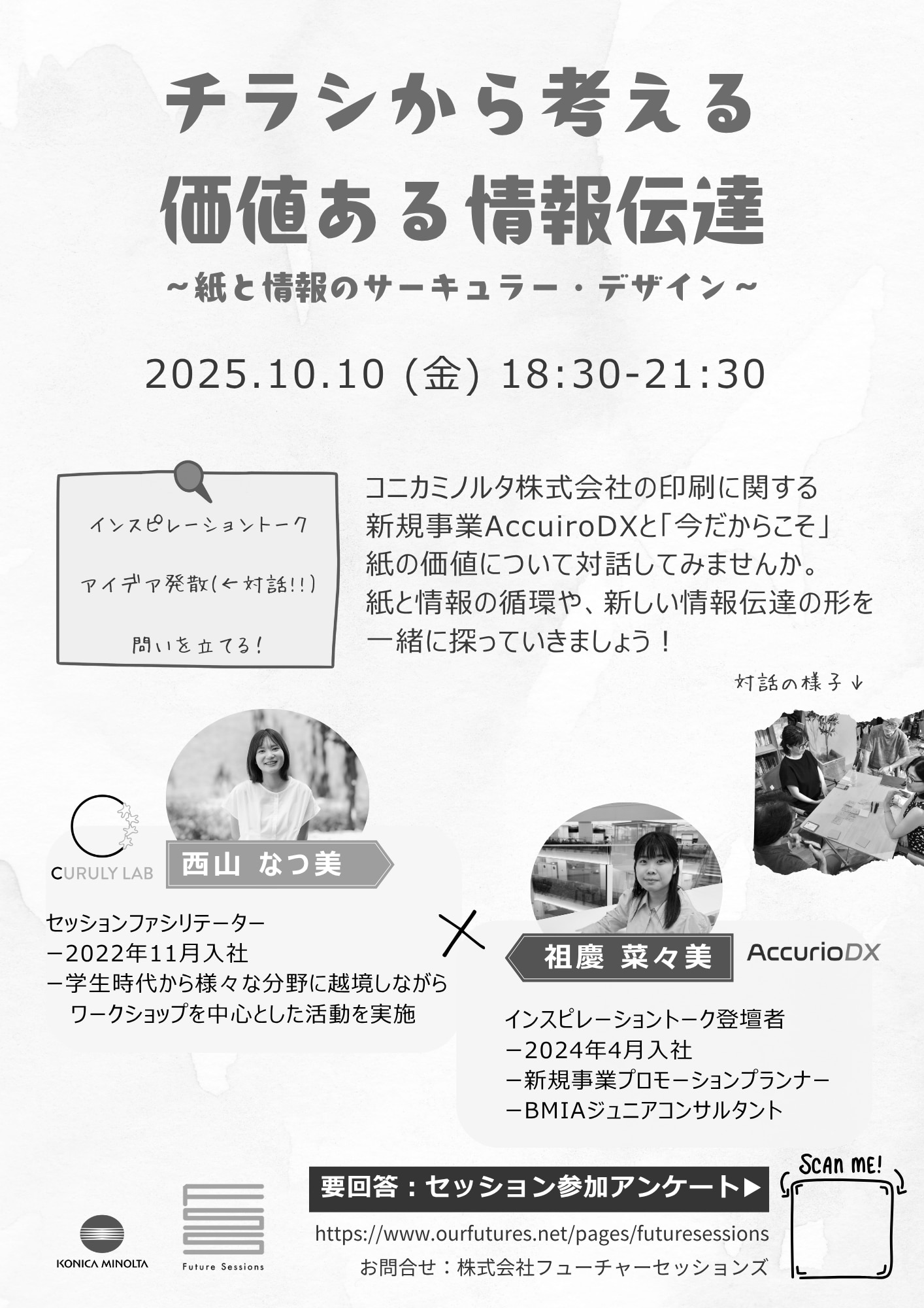 2025年10月10日、原宿 if spaceの1室に集まった業界も業種もバラバラで多様な8名。『チラシから考える、価値ある情報伝達 ~紙と情報のサーキュラー・デザイン~』というタイトルで開催されたセッションの参加者たちだ。本イベントは「もったいない」という生活者の感覚に着目し、対話型セッションを通じてサーキュラー・エコノミーのあり方を考える【株式会社フューチャーセッションズ】西山 なつ美さんと、コニカミノルタ株式会社で印刷業の新規事業に携わる【AccurioDXメンバー】祖慶 菜々美の双方でコラボして生まれたものである。